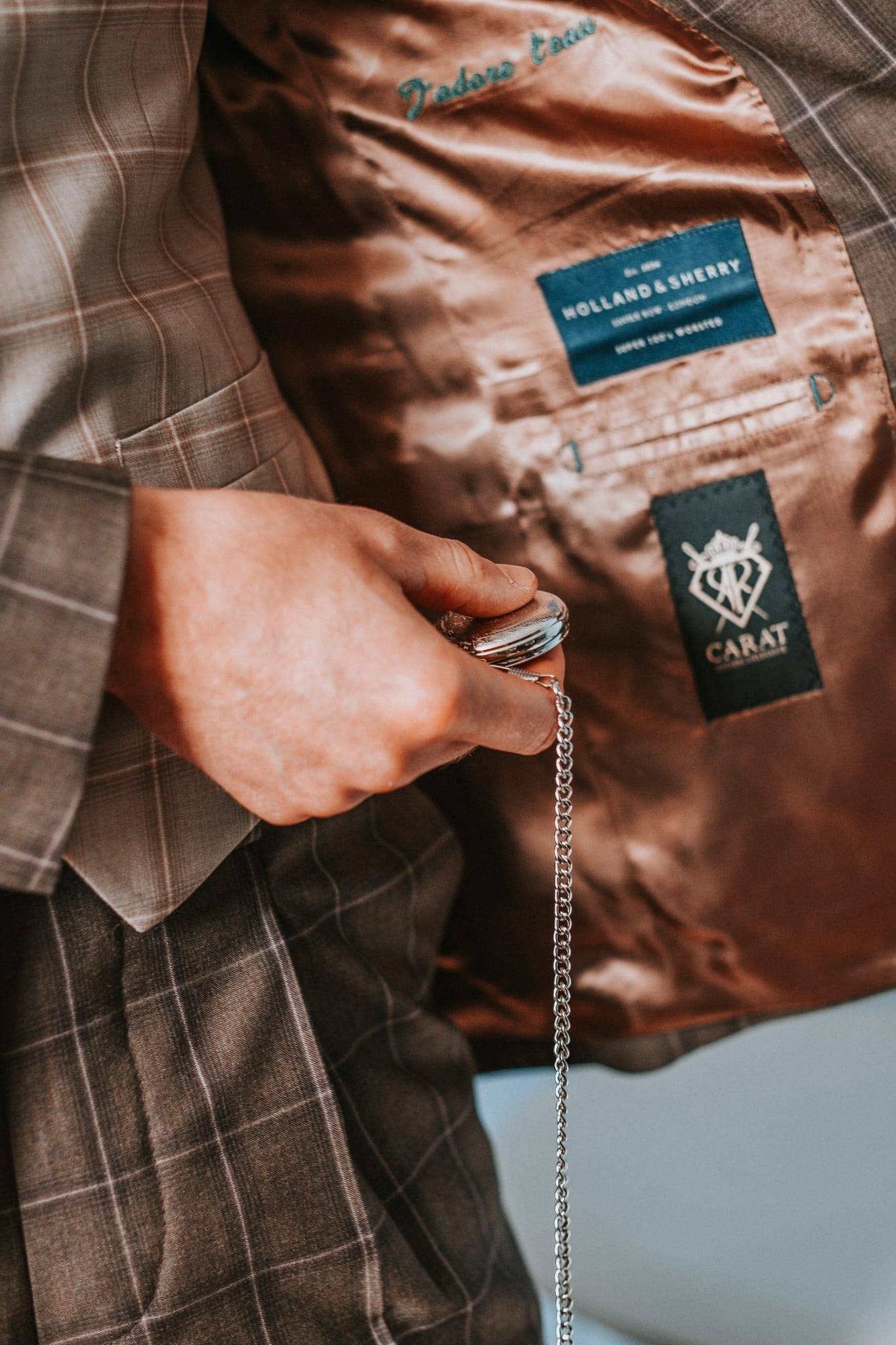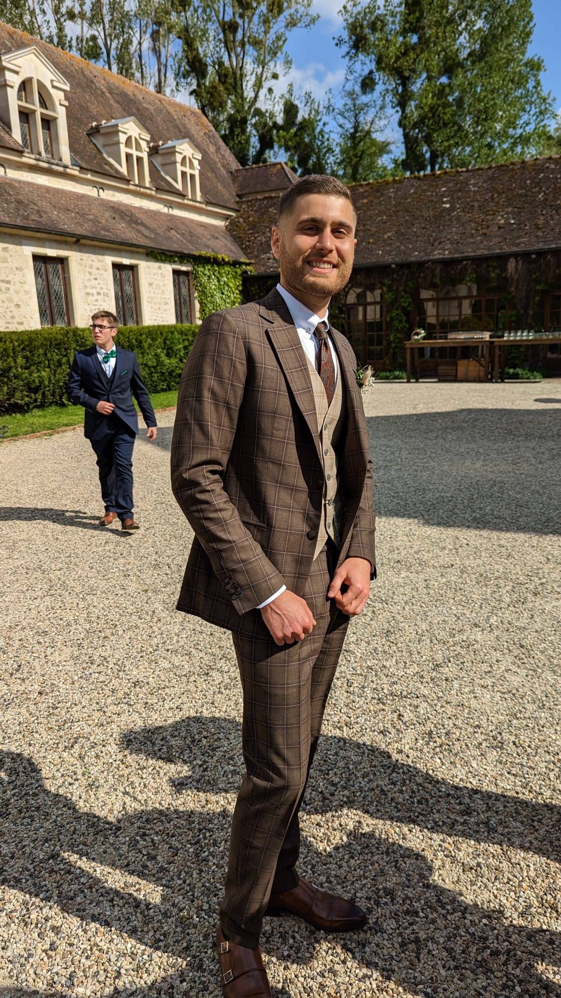 Un superbe costume 3 pièces sur mesure, jouant subtilement sur un dégradé de marrons, et arborant fièrement un motif à carreaux vif et prononcé, conférant à notre marié un stunning british look, le pantalon à pinces ajoutant encore plus à cet esprit néo-rétro.
