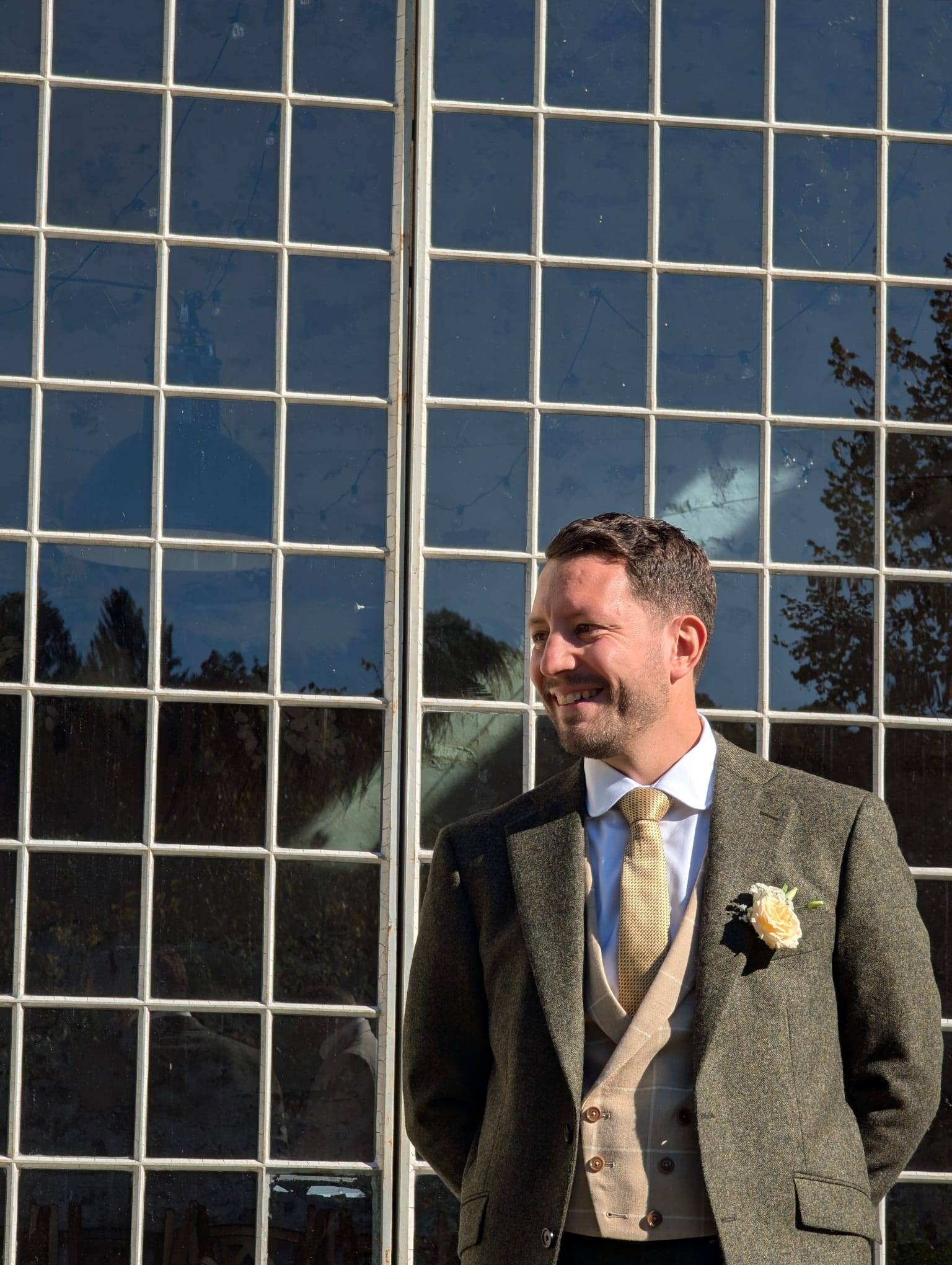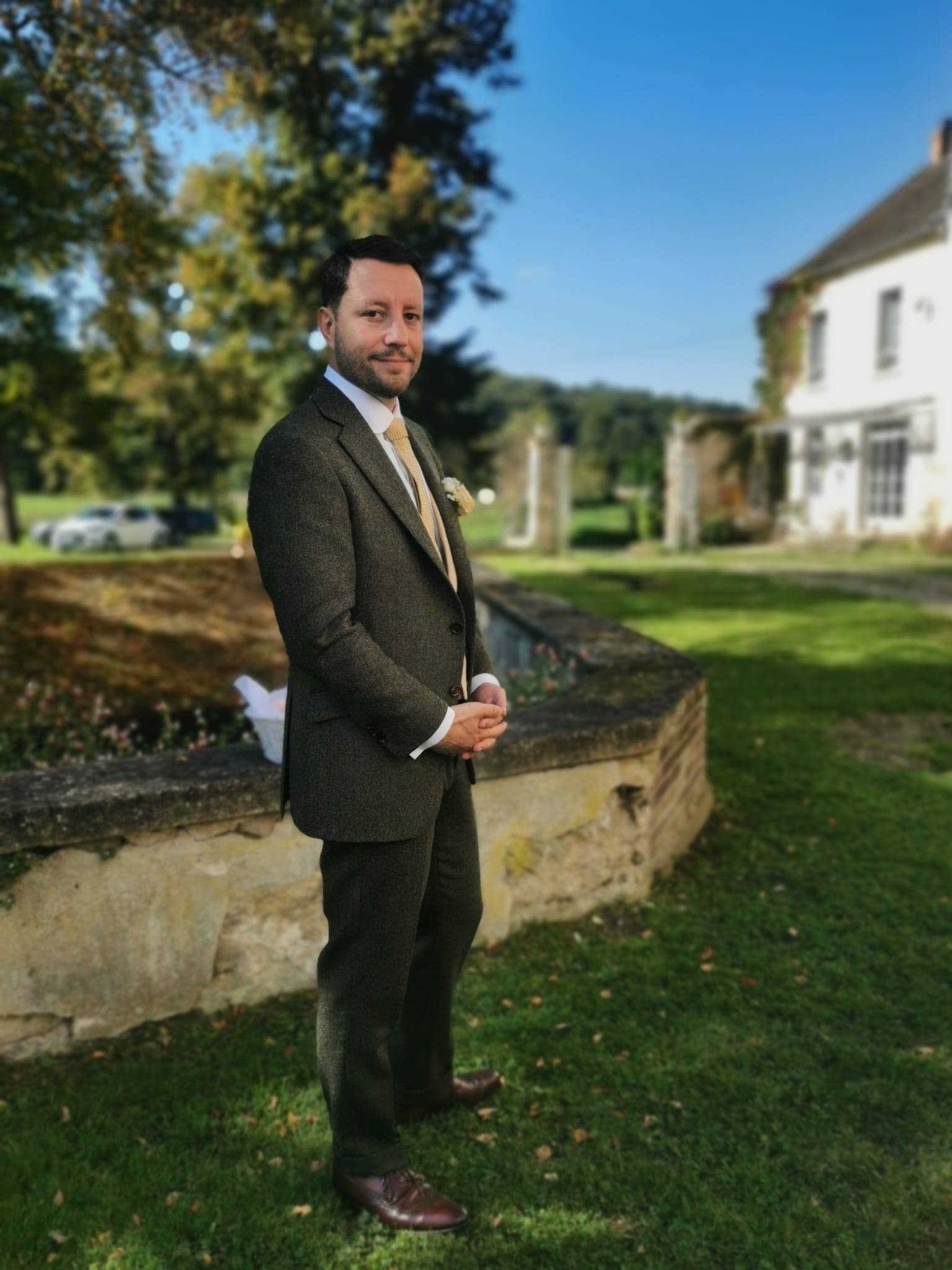 Le mariage automnal de Marie et Quentin restera gravé dans les mémoires, tant pour son atmosphère chaleureuse que pour l'élégance intemporelle du costume sur mesure de Quentin, signé CARAT, Univers d’Élégance à Saint-Germain-en-Laye (dans les Yvelines, proche de Paris). Pour cette journée unique, CARAT a su sublimer le marié avec un costume sur mesure réalisé par Scabal dans un soft tweed Donegal, un tissu raffiné de chez Moon, en parfait accord avec la saison. Ce choix de matière, avec ses nuances subtiles et sa texture légèrement rustique, évoque la douceur des paysages d’automne et l'élégance discrète des gentlemen britanniques.