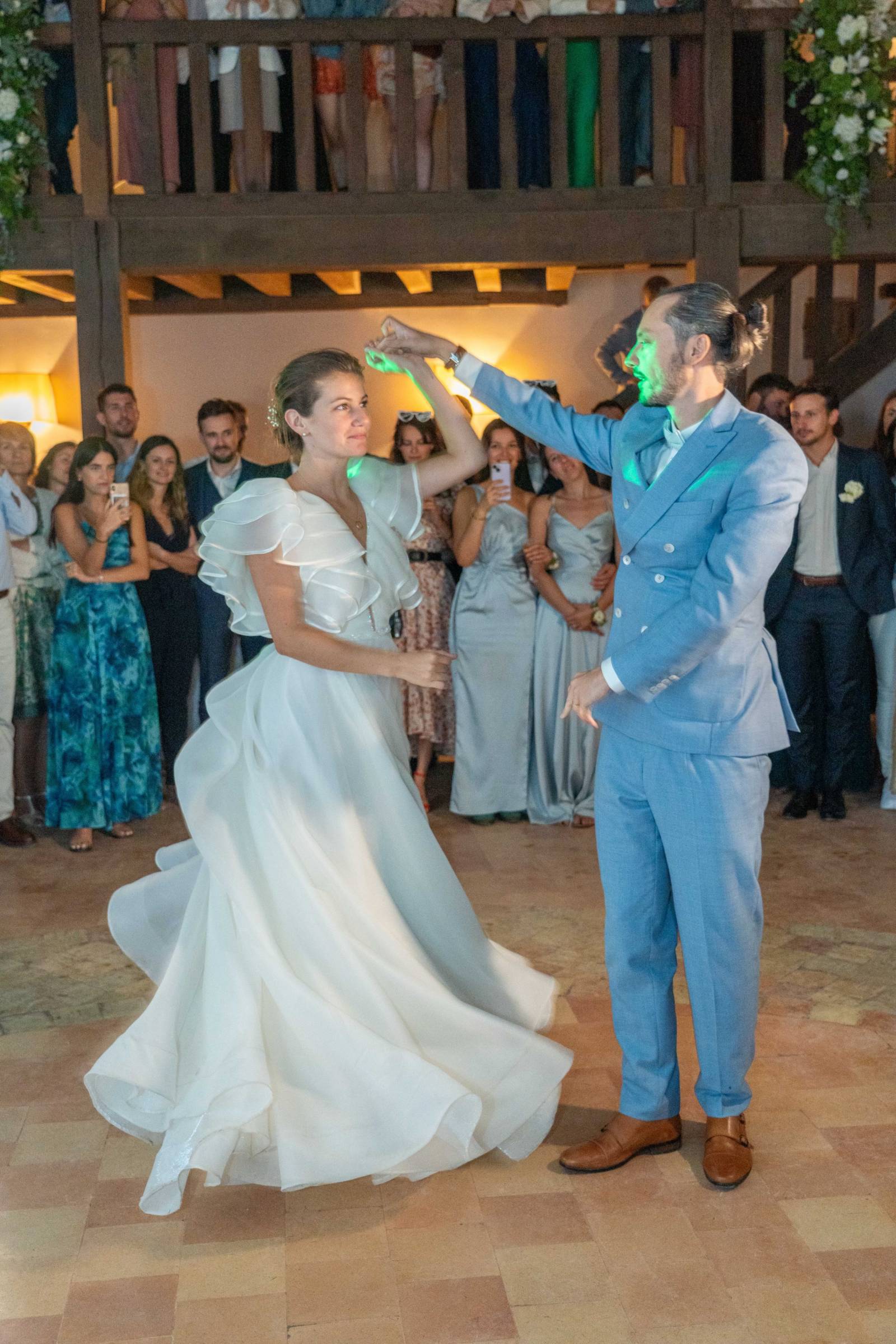 Le résultat ? Une sublime robe en taffetas blanc, tissu noble et lumineux, choisi pour sa légèreté et son tombé impeccable. La coupe jupon, agrémentée d’un drapé spectaculaire, allie majesté et confort, idéal pour une mariée active et danseuse. Les volants décoratifs aux épaules apportent une touche aérienne et romantique, tandis que les cristaux Swarovski sur le décolleté et les lanières du dos ajoutent un éclat raffiné. Chaque finition, minutieusement réalisée par Danelska Création, fait de cette robe bien plus qu’un vêtement : c’est une pièce unique qui raconte une histoire.