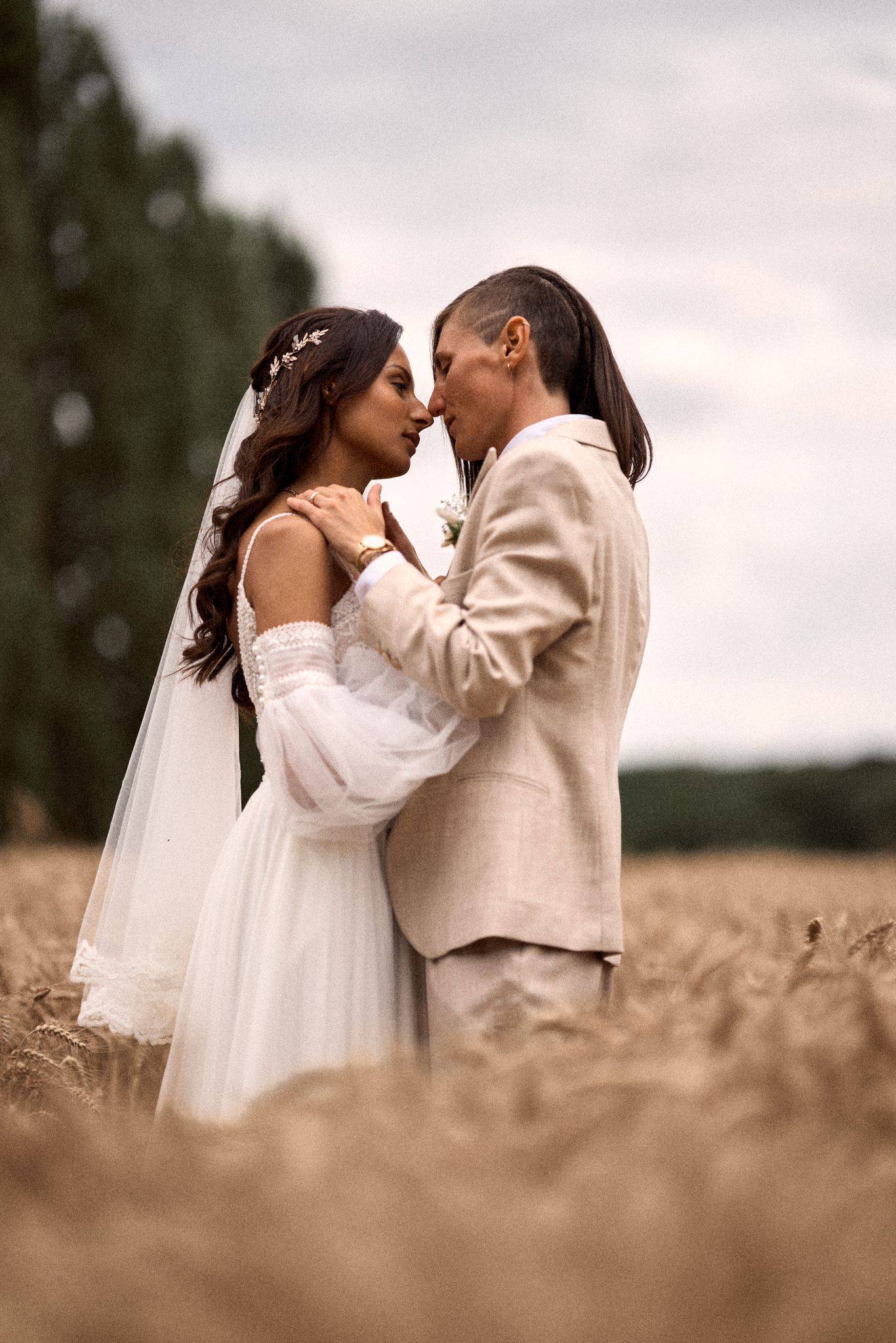 Pour ce mariage empreint d’émotion, Agnieszka a minutieusement sélectionné les tissus de couture sur mesure féminine, privilégiant la qualité, le tombé et la fluidité. Le tailleur femme de mariage a été conçu comme un chef-d’œuvre d’élégance : la veste structurée sans rigidité épouse les courbes naturelles, le pantalon ajusté souligne la silhouette tout en garantissant liberté de mouvement, et le gilet apporte une touche de raffinement supplémentaire grâce à ses finitions impeccables et son tissu légèrement texturé.
